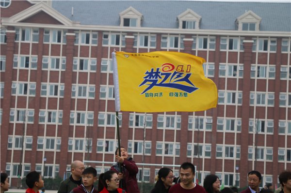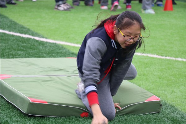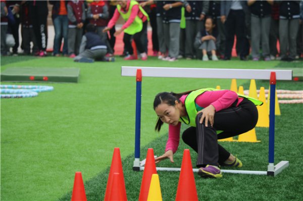 由十名家长和十名学生分别站在障碍物两边组成一支队伍,按照规则穿过障碍物,击掌接力,最后一个人完成时用时最短队为胜。现场满是同学们的欢呼加油声,班级旗帜挥舞在操场上空。