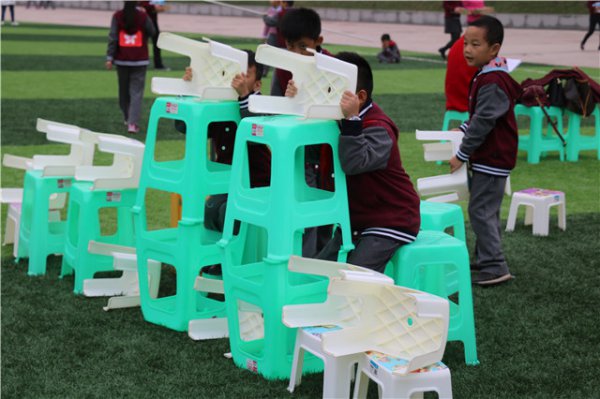 比赛结束的孩子们也没闲着,用凳子搭起了积木,创意无限。
