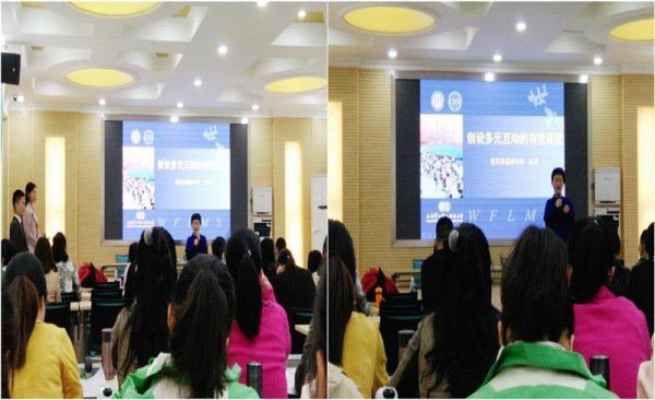 紧接着,上海市世界外国语中学的朱萍老师就绵阳东辰国际学校刘林老师的阅读课作了精彩的研讨发言。随即,朱萍老师就“创设多元互动的有效课堂”作了专题讲座,提到“多元互动”课堂的四大特点:课堂师生的多元互动、信息交流的多元互动、技能转换的多元互动和学习评价的多元互动。另外,朱萍老师还运用丰富有趣的教案案例讲述了她的“大英语教学观”,并与老师们分享了她多年来的教学经验。