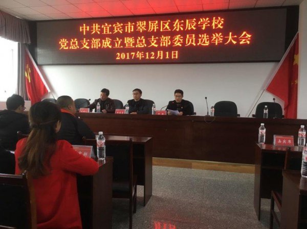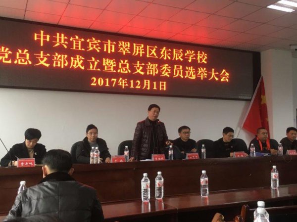 宜宾市翠屏区东辰学校在各级领导的关心下,社会各界朋友的支持下,学校不断壮大和发展。宜宾东辰汇聚了来自四面八方的优秀党员儿女,他们多么渴望能回到组织的怀抱,成立中共宜宾市翠屏区东辰学校党总支委员会是所有东辰人共同的梦想,经翠屏区委组织部和翠屏区教育局党委批准同意,2017年12月1日下午2时整,中共宜宾市翠屏区东辰学校党总支部成立暨党总支部委员选举大会如期而至,亲自莅临本次大会的领导有翠屏区教育局党委委员、副局长王高富、党政办主任郑强。