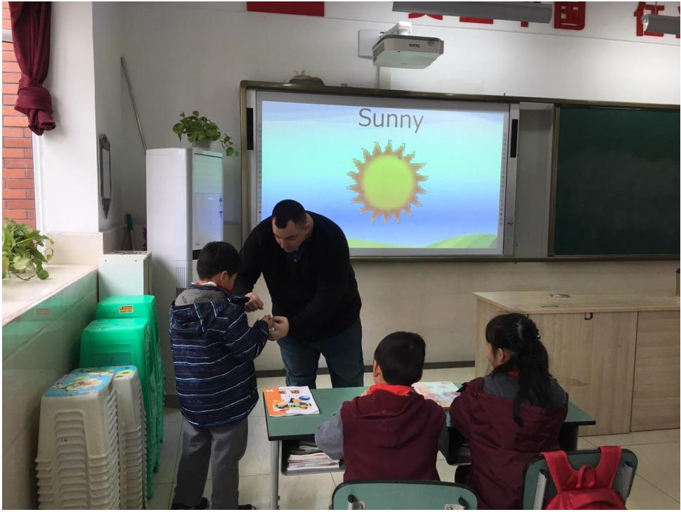 很快,Mark老师走进了一年级的教室。他亲切地与孩子们问好,宝贝们一激动又兴奋地回应。别看这些一年级的孩子们小,在Mark老师的引导下,一个个恨不得把自己所会的英语都表达出来。Mark老师来自美国,和孩子们聊的第一个话题是天气,这是美国人喜爱的一个话题。果然,孩子们对Mark老师喜爱有加,课堂气氛活跃,孩子们兴趣盎然,与Mark积极互动。