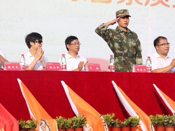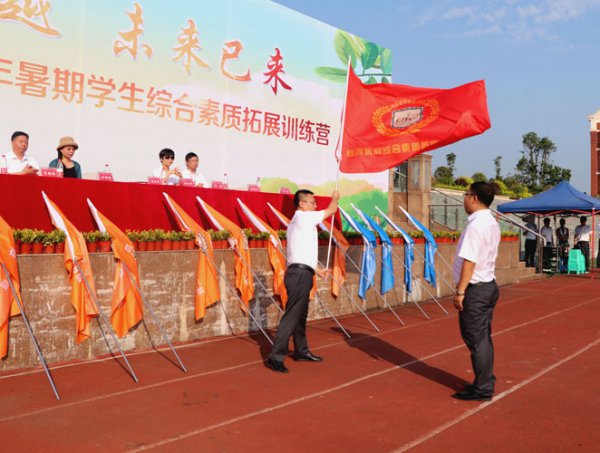 黄迪定校长挥舞营旗,亲手传递到陈永红校长和于驰校长手上;陈校长和于校长挥舞着营旗,传递到各营长手上;营长挥舞着营旗又传递到营员代表手上!