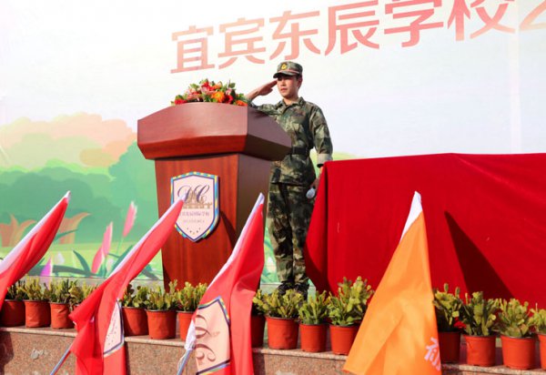 伴随着嘹亮的国歌,五星红旗飘扬于苍穹;和着悦耳的校歌,校旗冉冉升起。宜宾东辰学校总校长黄迪定先生开始了他以《熔铸军魂追求卓越,激扬青春未来已来》为主题的激情澎湃、斗志昂扬的讲话。