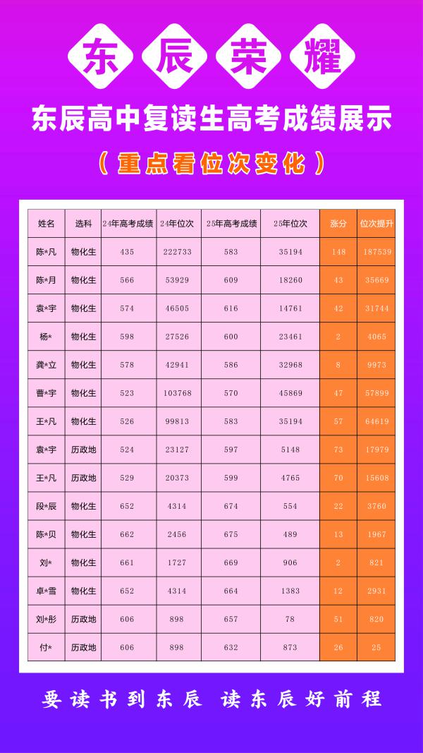 2025东辰高中复读生高考成绩展示