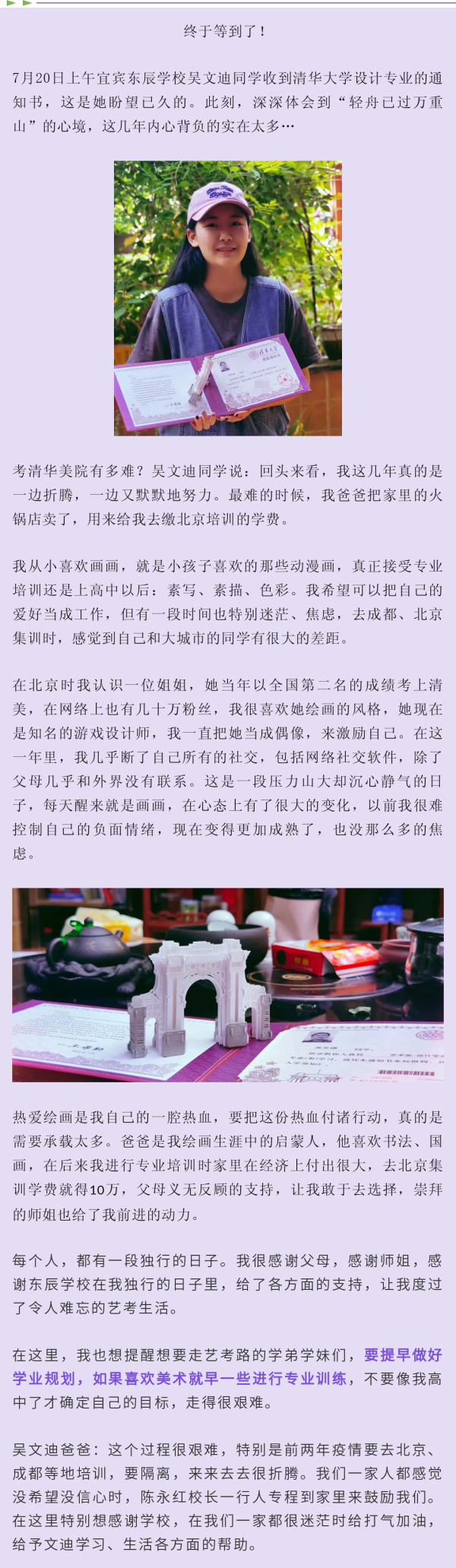 东辰女孩考上清华美院:喜欢美术就早些进行专业训练