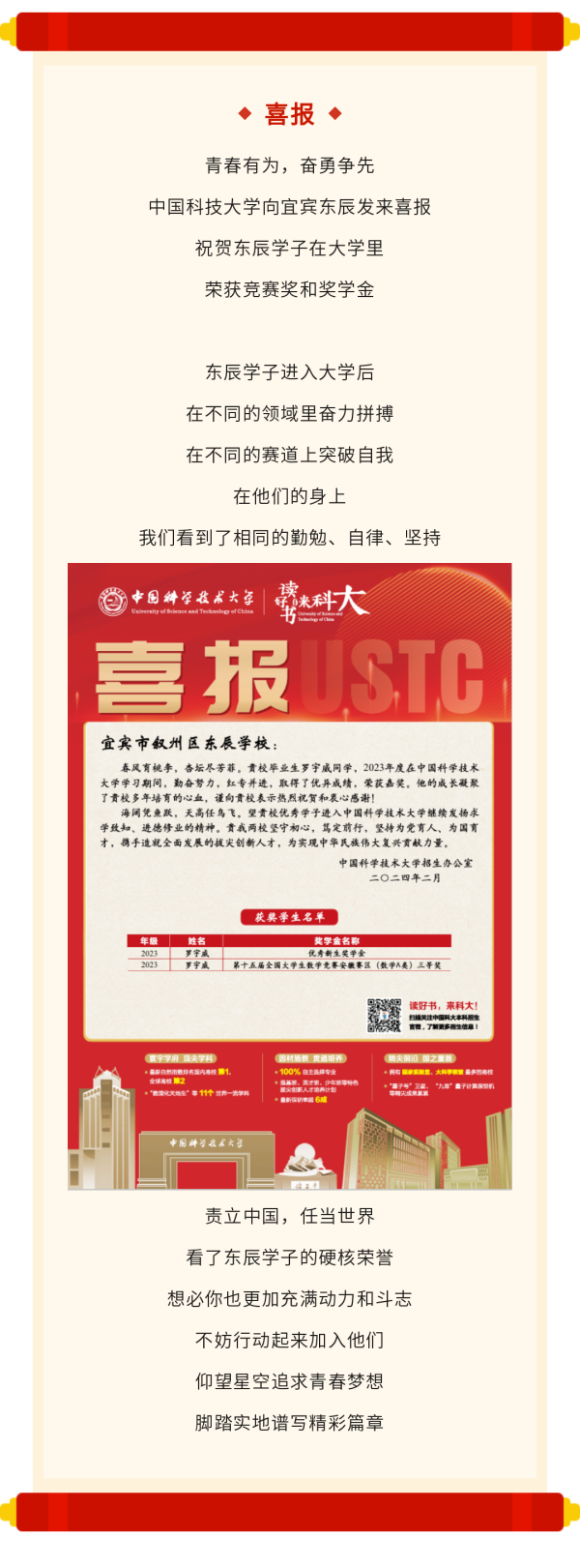 中科大发来喜报!祝宜宾东辰学子获奖