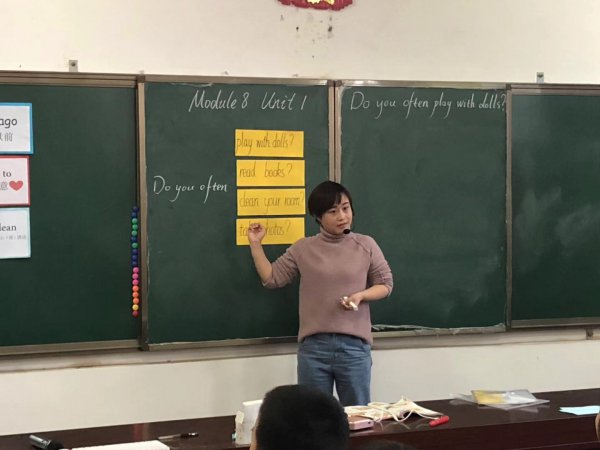 第二节课,由文敏燕老师执教六年级上册课文《 Do you often play with dolls?》。上课开始,文老师便让孩子们猜一猜:照片上只露出眼睛的同学是谁?由于是身边的同学,孩子们在猜的过程中发出阵阵会心的笑声。接着抛出问题:Who took these photos?(谁拍的照片呢?)当看到班主任的照片出现时,孩子们沸腾了,也直接将课堂引入本课情境,谈论照片并描述你是否经常做某件事情。在整个教学过程中,文老师环环相扣,层层递进,几乎用全英文与当地孩子沟通,努力启发孩子们敢于开口,乐说英文。而孩子们在文老师赞许的眼光和语言鼓舞下,也自信地站起来与老师频频互动,让观课的老师感到非常惊讶。文老师亲切的教态,诙谐幽默的语言让整堂课高效且轻松有趣。