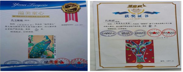 孔玉彬彬三岁就开始学画画,她表现出了过人的绘画天赋,再加上后天的刻苦努力,她成了一位小画家。她先后荣获了“雏鹰”杯全国少年儿童书画大赛金奖,第七届全国儿童书画大赛金奖。