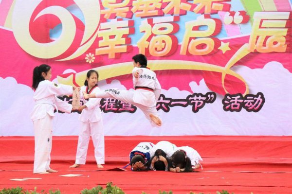 本次艺术展演节目均是东辰教师平日在社团课及选修课中培训编排的节目。学校拉丁舞社团的孩子们出场了,她们的舞姿闲婉柔靡,裙裾飘飞;荣获川南少儿组跆拳道团体一等奖的东辰跆拳道社团的孩子们自信满满,动作迅猛凌厉;刚荣获省健美操一等奖的孩子们压轴登场,翩若惊鸿,婉若游龙……