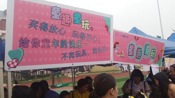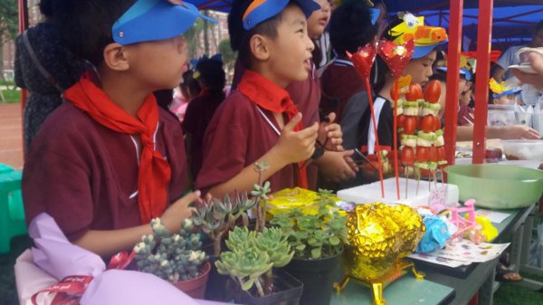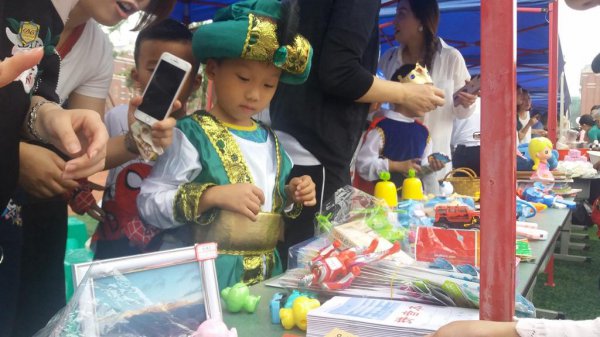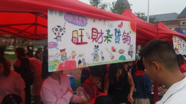 作品拍卖及文艺展演的同时,操场上三十余顶帐篷搭建成了一个个小小商品摊位,孩子、家长、老师齐心协力,理货员,导购员,收银员各就各位,各司其职。小商品琳琅满目,“冰雪奇缘玩饰区”、“童趣童玩”、“旺财杂货铺”、“樱花的记忆”……玩具、盆栽、花卉、食品等应有尽有。