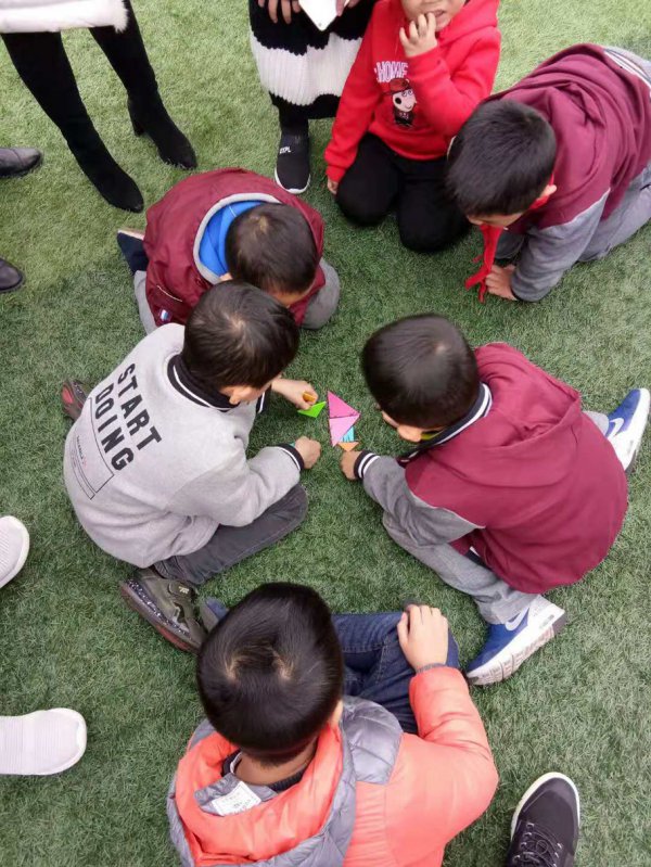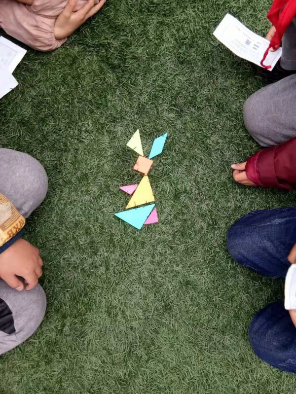 镜头一:一副副小小的七巧板,在孩子们一双双灵巧之手的摆弄下,拼出了一个个形态各异的小天地。不仅感受了组合图形的无穷奥妙,还领悟到了创意七巧板的无穷乐趣和成功的快乐。