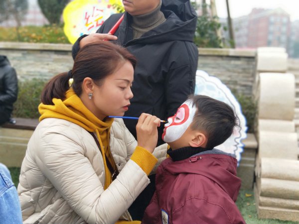 操场的另一边是创意美工坊体验区,这里的书法、脸部彩绘、亲子DIY手工作品、亲子制作彩面泥、剪纸吸引了好多小朋友和家长。书法老师执起毛笔,让你领略汉字的美,并耐心地教小朋友现场书法。脸部彩绘处,一群高年级学生拿起画笔帮小朋友脸上绘画,转眼间,小朋友就变成可爱的猫咪、精灵、海贼王了。来到亲子DIY手工和亲子制作面泥的地方,一幕幕温馨有爱的画面展现在我们眼前。