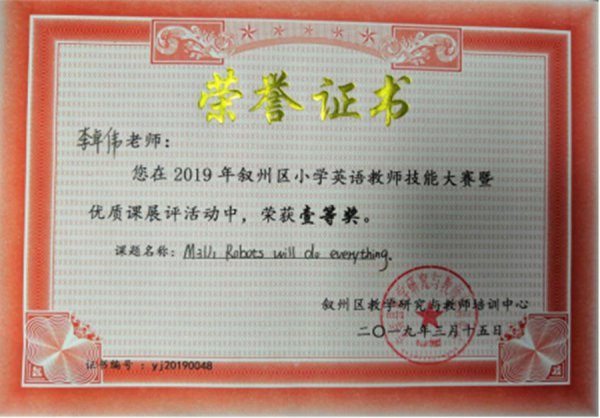 说课上课亮点多,素养出色勇夺冠!最终,李卓伟老师凭借课堂教学师生的精彩表现以及出色的专业能力,获得了2019叙州区小学英语教师技能大赛暨优质课展评活动一等奖,并将在4月代表叙州区参加宜宾市小学英语教师技能优质课比赛。