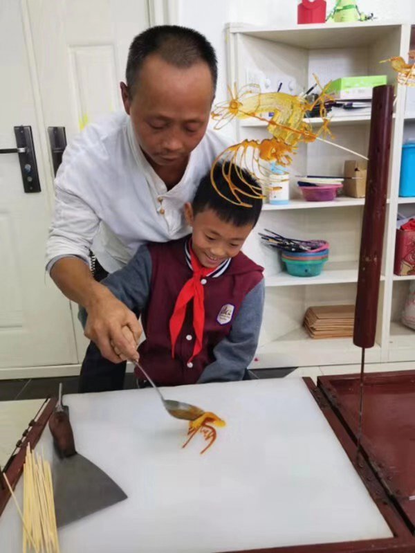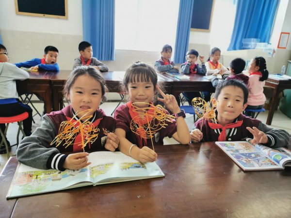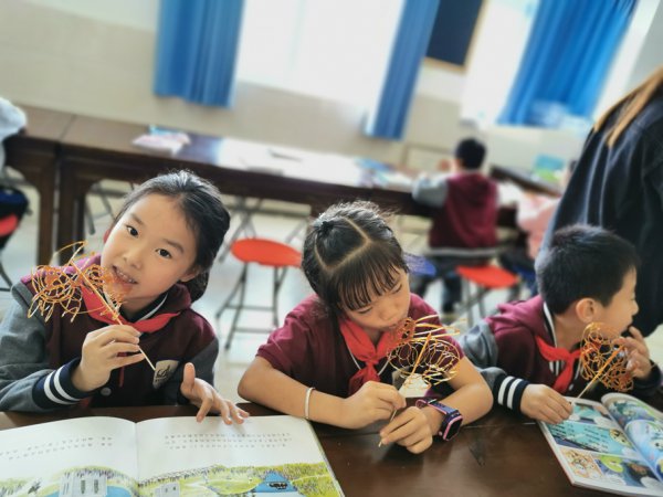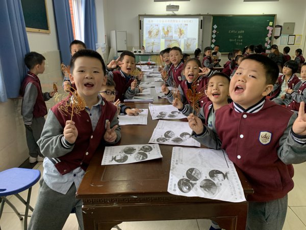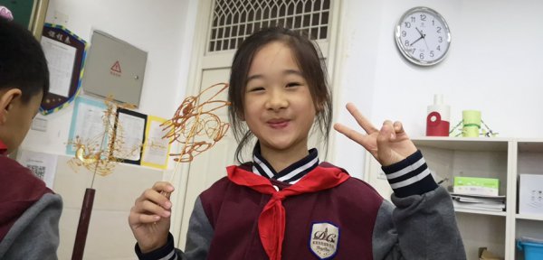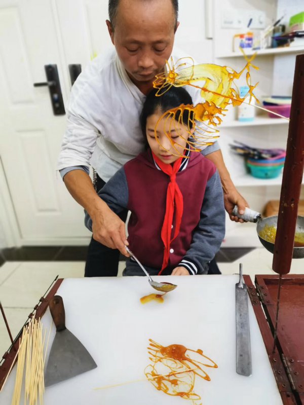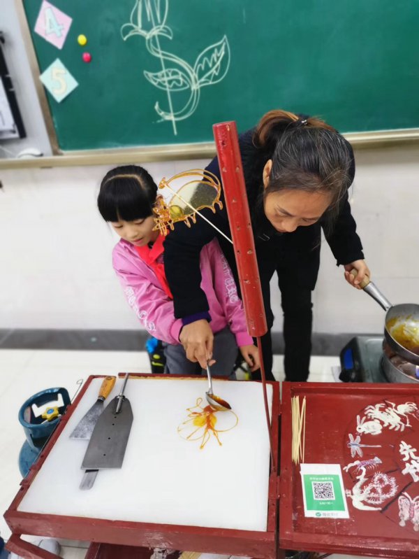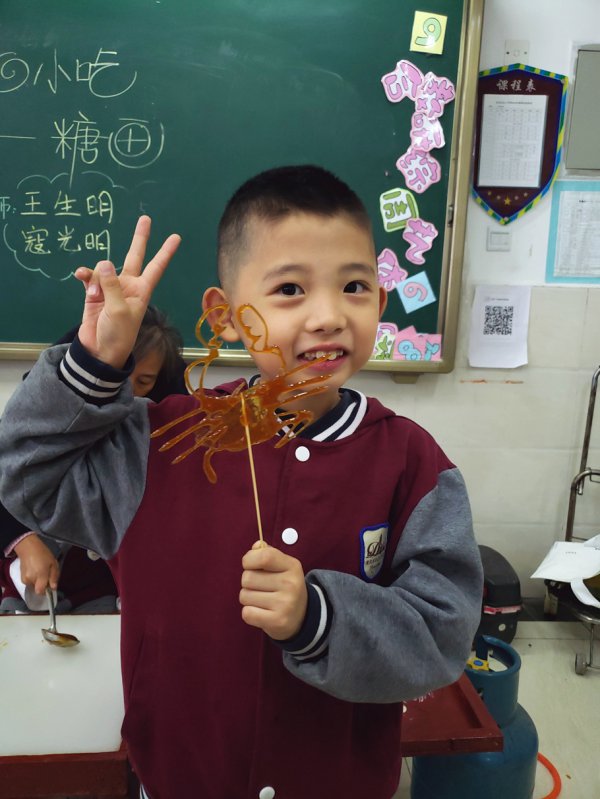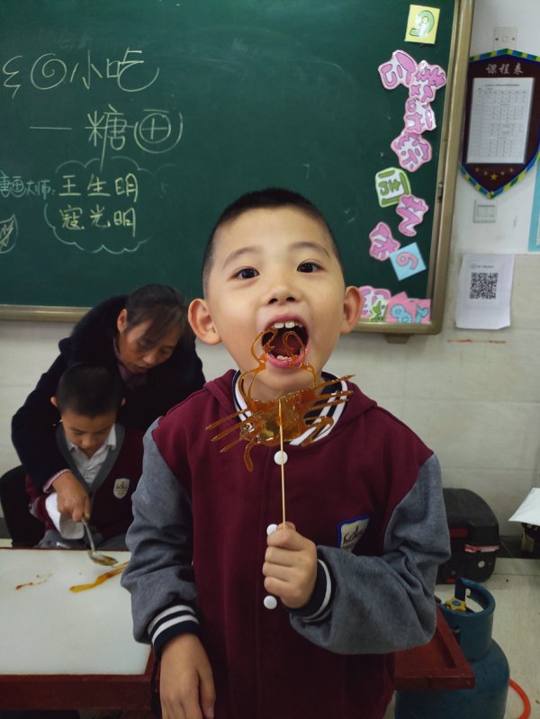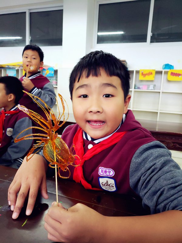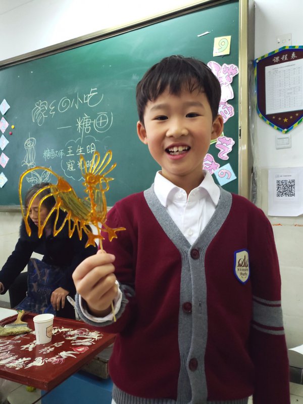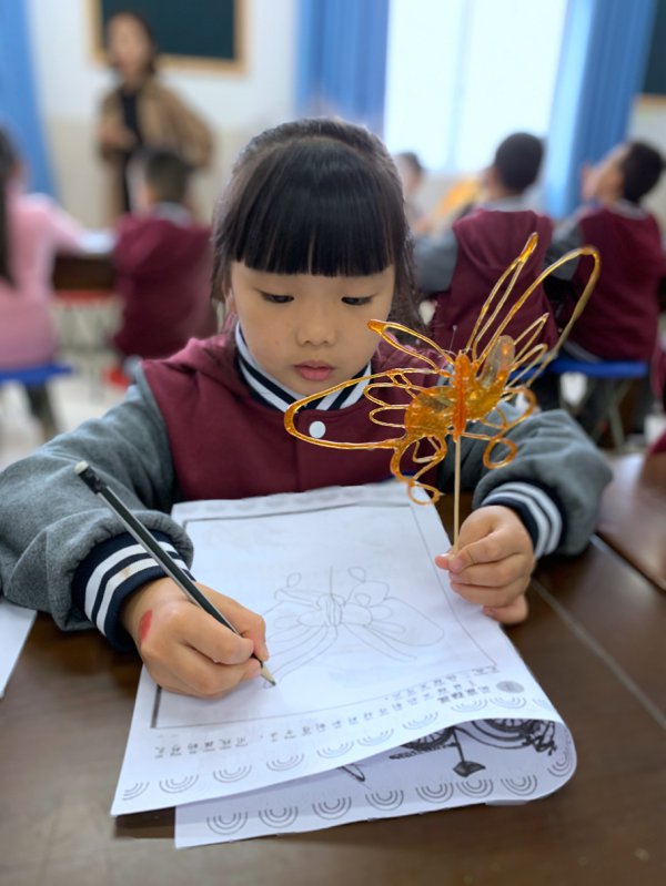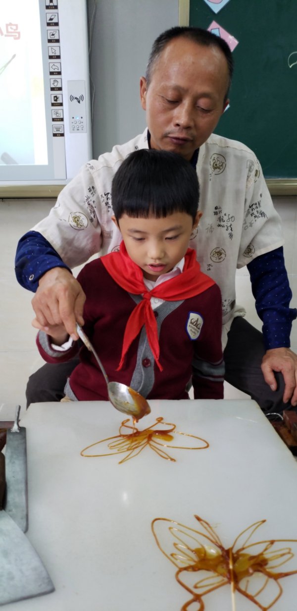 学校还请到了宜宾两位知名的糖画艺人,把这样有趣的民间艺术带进了课堂,让孩子们能亲手制作糖画。