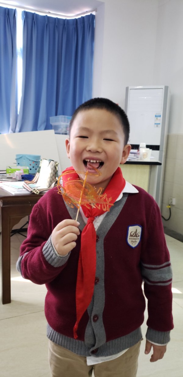 品尝劳动成果啦!看到自己选择的糖画动物是这样的栩栩如生,孩子们都舍不得吃,抓紧时间将它的美丽定格在画纸上!