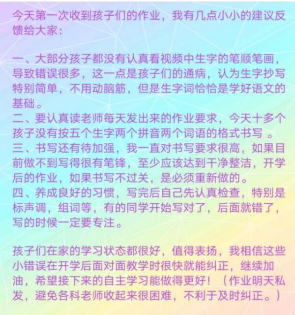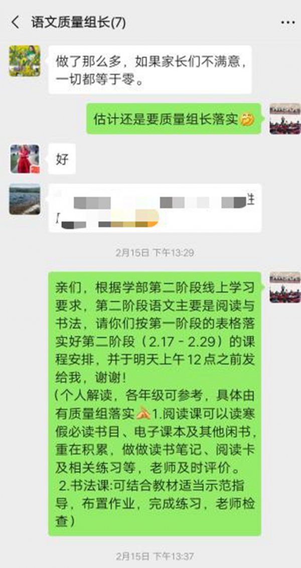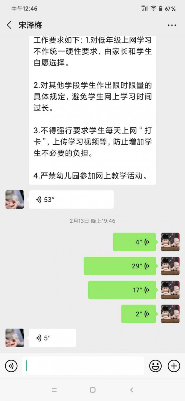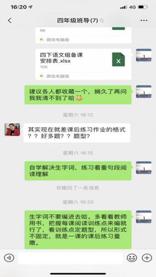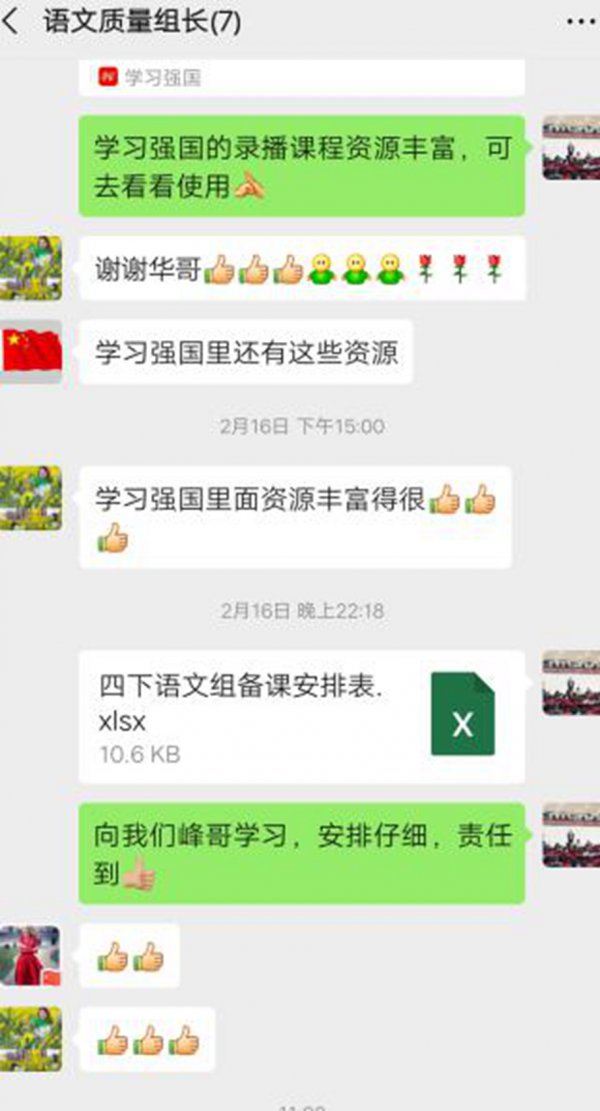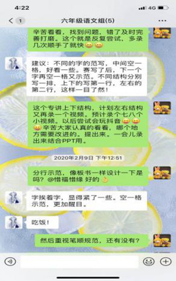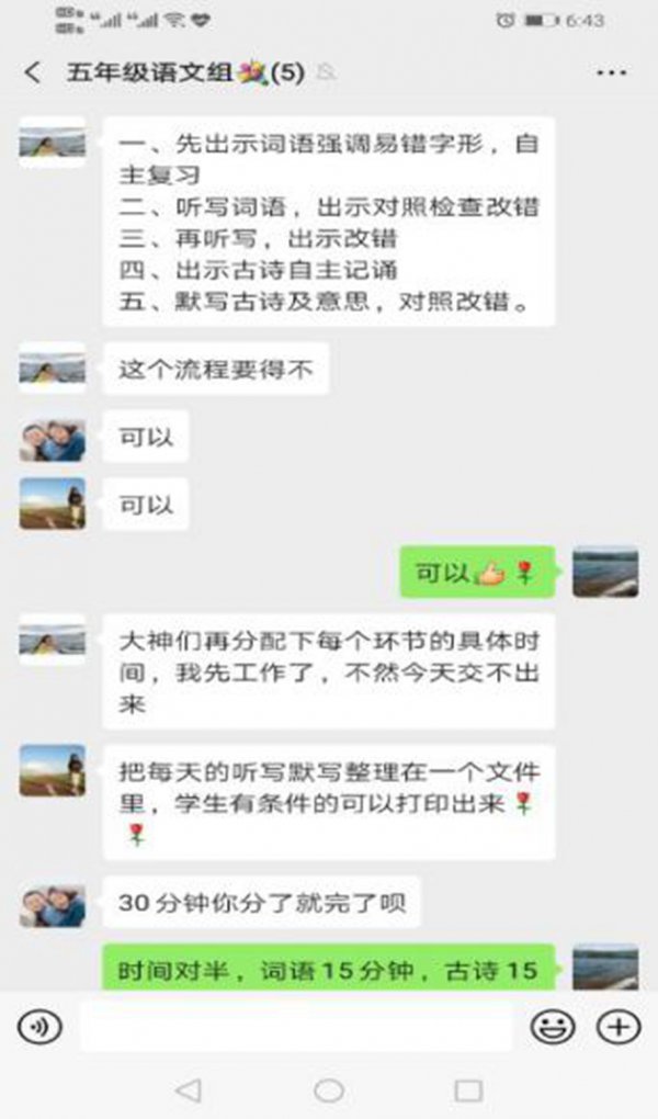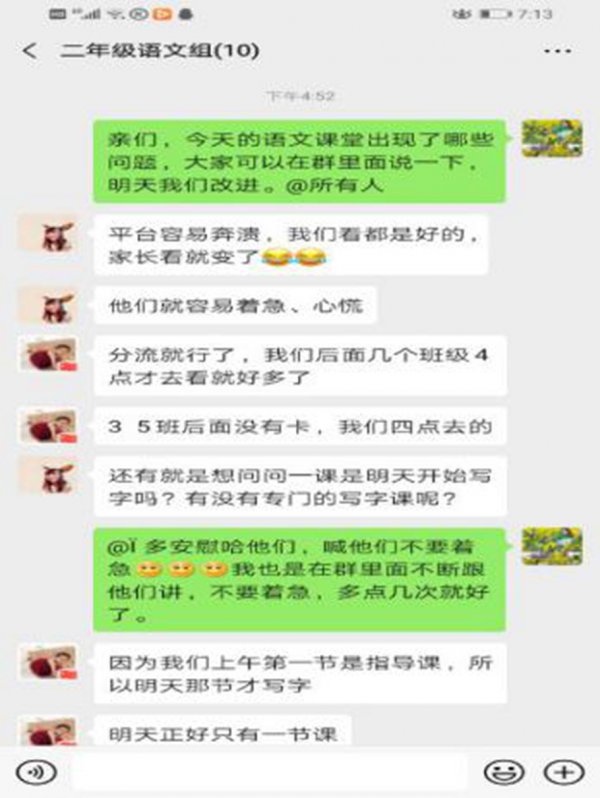 全组老师充分利用微信群交流、视频会议、观摩直播课堂等方式开展集体备课、磨课,力争让每一节课都言简意赅,让学生对每一个知识点都能更好掌握。课后,教师会对作业进行批改和反馈。必要时,老师们还会对孩子再次进行“一对一”的线上辅导。每天网课结束,各质量组的老师都会对当天的上课情况进行交流和讨论,根据家长的意见和建议。对上课内容、形式、作业等一系列工作进行调整和安排,积极向分管领导汇报,做到了有计划、有落实,并利用周末休息时间完成了后一个星期网课作业、内容、微课的全部工作。