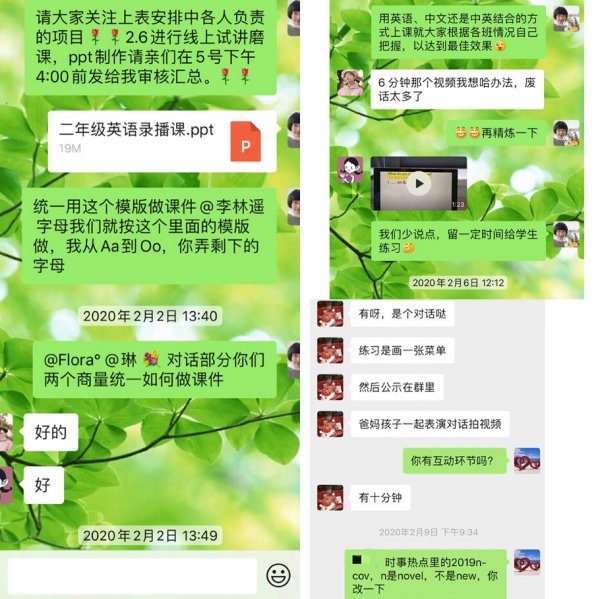 严把线上教学质量关,确定质量组长为第一责任人。云端教研,通过微信群讨论,视频、语音会议,对上课教案和课件进行反复修改,由质量组长定稿,最后进行直播或录播课,确保线上学习的高质量。