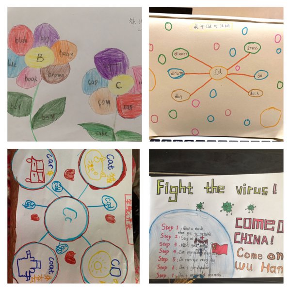 课堂上与老师积极互动,课后学习热情持续高涨,英语儿歌、英语字母操、英文菜单制作、抗击新冠状病毒手抄报……