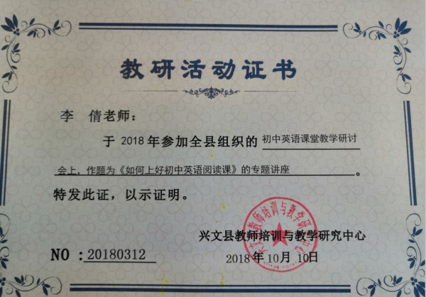 宜宾东辰初中部李倩老师受邀请参加兴文县初中英语课堂教学研讨专题讲座,在此次会议上,李倩老师给大家带了了《如何上好初中英语阅读课》的专题讲座。