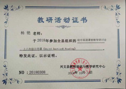 2018年10月11日,兴文县师培中心在香山中学格致楼学术报告厅召开了2018年全县初中英语课堂教学研讨会。在本次活动中,来自宜宾东辰学校的青年骨干杨艳老师不仅在课堂教学中起到了带头示范作用,而且在教研活动中展示了结合实际的新教法,赢得现场师生的一致好评。同时来自宜宾东辰学校的青年骨干李倩老师作题为《如何上好初中英语阅读课》的专题讲座,深入人心。