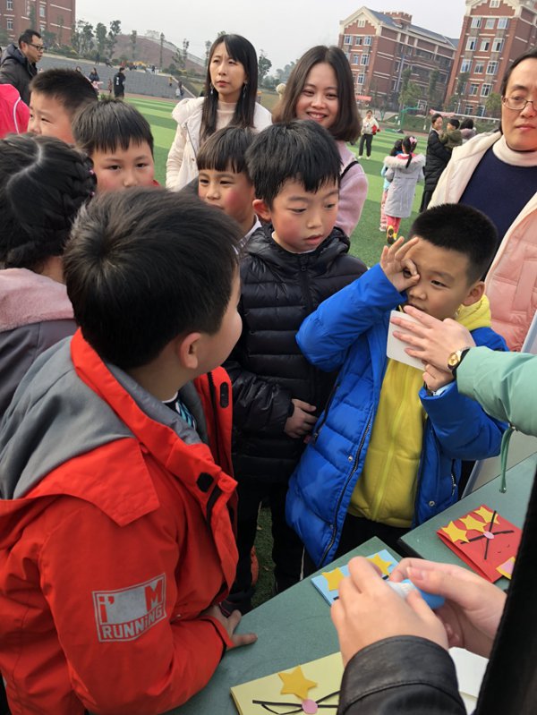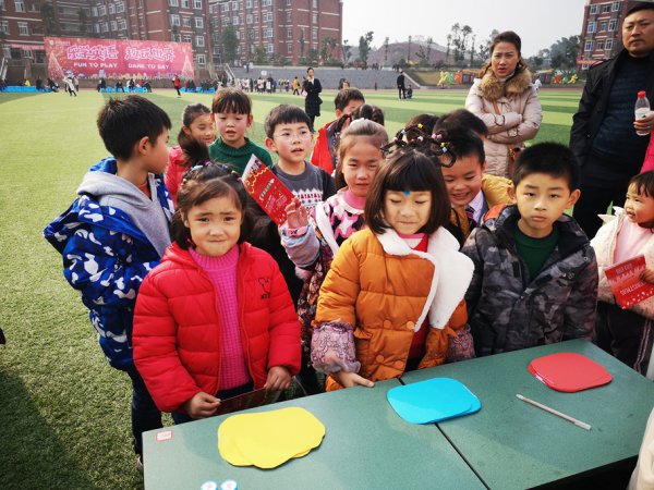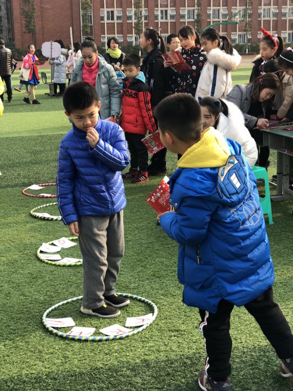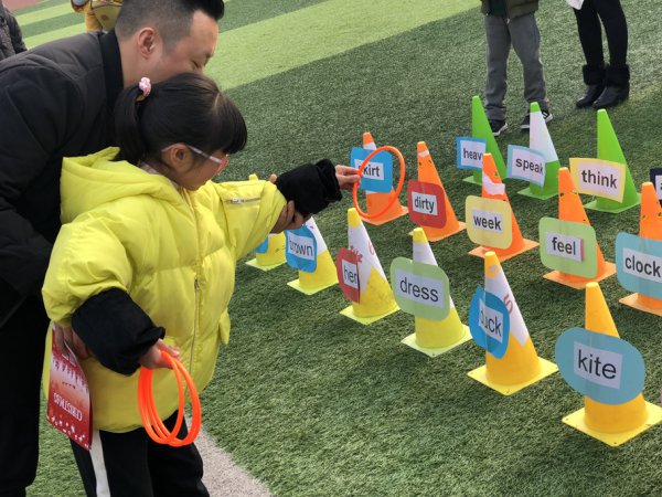 名师课堂结束后,孩子们心潮澎湃,满怀信心,开始了本次国际英语活动节的闯关游戏。看,低年级的闯关活动——“单词套圈”,色彩缤纷的道具吸引了不少孩子前来挑战。家长也是非常的热情,亲身上阵为孩子指导示范,亲子团结一心,其乐融融。