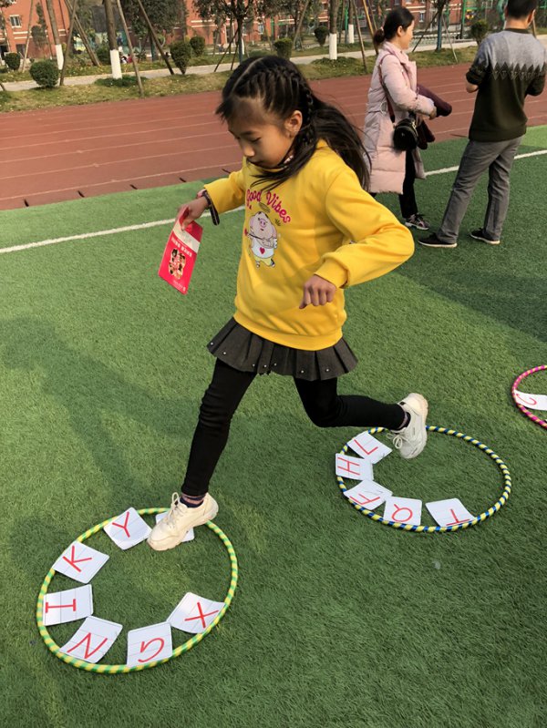 第二个闯关活动是“单词跳跳圈”,不要看有的孩子们平时记单词不上心,可到了这个环节,每一个孩子的口中都在念念有词地拼读着学过的英语单词呢。“你认真的模样,是我最爱的一刻。”希望这些孩子在以后的学习生活中,也能像今天一样,做到事事认真。
