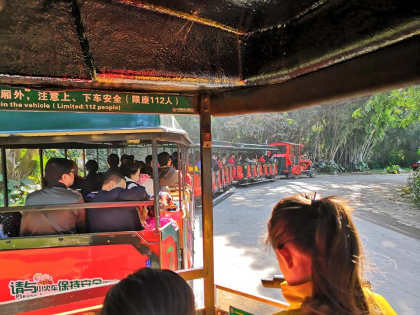 10:00我们到长隆野生动物园。排队、安检、验票,步行10分钟到观光车乘车点。每辆观光车4节车厢,每节7排座位,每排坐4人。观光道路左右两侧自由生活着各种野生动物,均是放养,景区导游一路讲解,孩子们兴致勃勃。