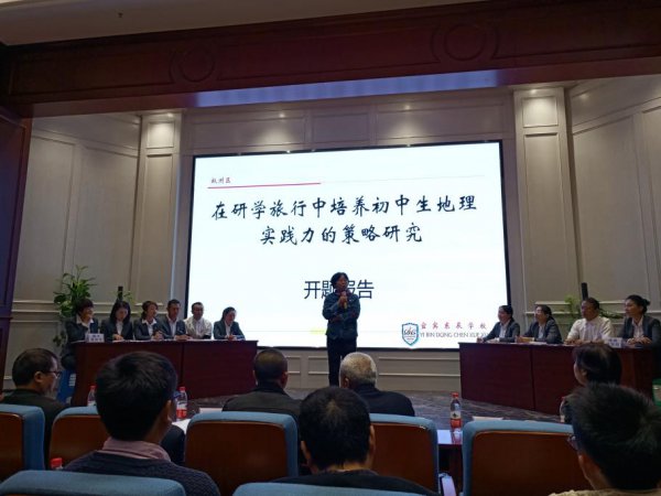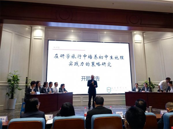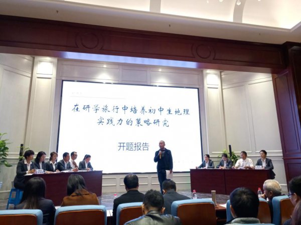 随后,主研人李霞老师代表《在研学旅行中培养初中生地理实践力的策略研究》课题组作开题报告陈述。李霞老师从课题研究背景、核心概念界定、研究综述、研究意义、研究内容、研究对象、研究思路、措施、方法、原则、研究步骤、研究预期成果、效果、研究条件保障、研究参考文献等十二个方面向与会专家和教师们介绍了地理组课题的开题报告。