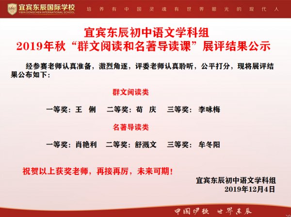为推进宜宾东辰学校“学本思维,高效课堂”模式建设,促进教师专业发展,促使老师们更好地挖掘教材,整合教材,提升群文阅读和名著导读教学水平,提升阅读教学效果,实现师生教学相长。初中语文学科组于近日举办了2019年秋期初中语文学科组“学本思维,高效课堂”模式之“群文阅读与名著导读”专题教学展评活动。