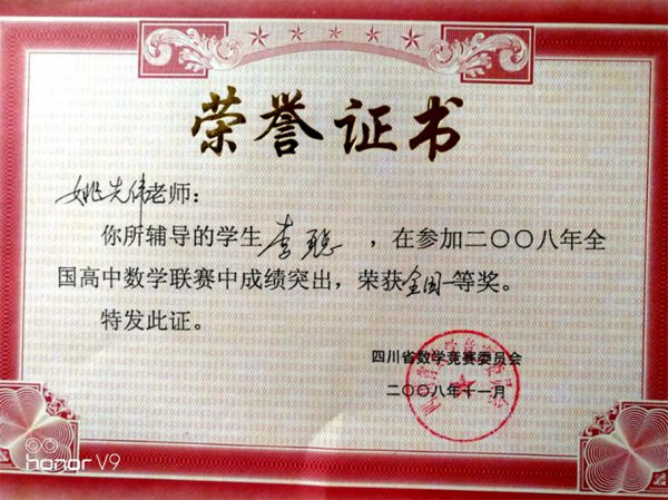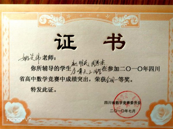 姚老师曾辅导学生十余人获全国高中联赛一等奖(三人进入冬令营),在专业刊物上发表竞赛文章五十余篇。并且姚老师连续八年在四川省数学学会“竞赛与自主招生”夏令营活动任教。参加过四川省高考命题、审题、考试说明修订工作,担任过四川省髙考阅卷指导委员。