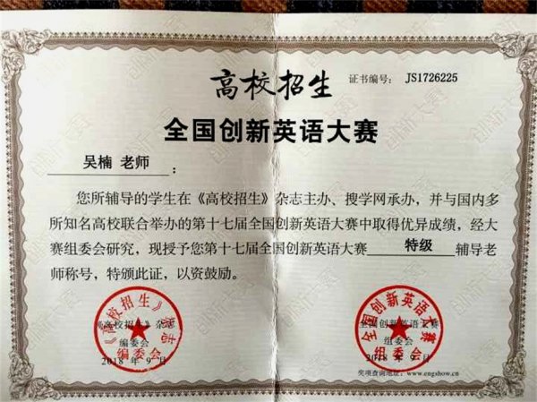 吴楠,英语竞赛教练,市首批新课程改革组成员,市名师工作室成员,市师德标兵,市骨干教师,市教学质量管理“特等奖”,市优秀备课组长,省优质课“二等奖”,市优质课“一等奖”,市教学质量“一等奖”,市拔尖人才教学“一等奖”,多名学生被清北等高校录取。