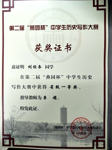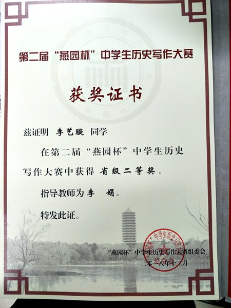 本社是由高中部李娟和黎远华两位历史老师开设的选修课。本选修课程主要是针对历史写作和历史剧本写作进行培训,通过指导学生的写作,参加相应的历史写作比赛,为985、211高校文科类专业自主招生做准备。本学期历史写作社完成了两篇历史写作和两篇历史剧本的写作。其中刘垣杏同学的《我的爷爷是老兵》和李艺璇同学的《国立剧专在江安的印记》获得了“燕园杯”历史写作大赛省一等奖和省二等奖的好成绩。