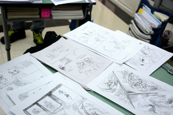 本社是我校学生开设的社团,指导老师是许倩老师。在动漫社中集结了一批爱好动漫的学生,他们一起探索动漫的发展史,一起探讨动漫中的经典桥段,一起研究COSPLAY,一起创作动画故事。下面我们一起来欣赏他们的原创手稿动漫设计吧!
