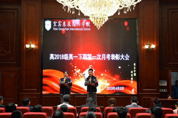 春回大地百花竞相绽放,不负春光学子砥砺前行。2019年4月2日星期二18点20,宜宾东辰高2018级春季学期第一次月考表彰大会暨人文月启动仪式在博雅楼一楼会议厅隆重举行。高2018级全体师生参会,会议由李欣然、李承昊两位同学主持。