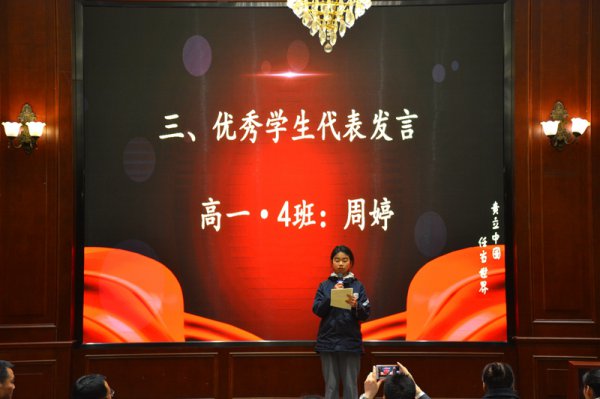 优秀学生代表高一4班周婷同学发言,她发言的题目是《学习之路以勤为径》。古语有云:操千曲而后晓声,观千剑而后识器,相信同学们在聆听了她的发言后,会乘勤奋之舟,驶抵理想的彼岸。