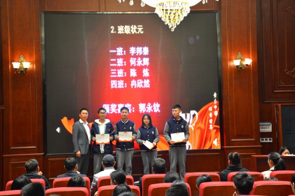 张国琼主任总结发言。张主任首先肯定了同学们在月考中取得的优异成绩,勉励大家继续努力。指出月考表彰会应创新,在下一学月中,增设“学习标兵”奖项,鼓励同学们踊跃报名评奖。