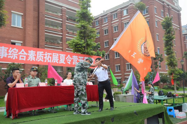 仪式第三项,授旗仪式。高中部校长于驰庄严地高举猎猎大旗,振臂挥舞,然后郑重地交到各营代表手中。最后于校长用浑厚喷薄之气宣布:高2019级军事综合素质拓展夏令营正式开始!