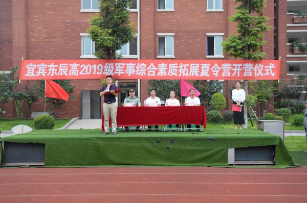 8月19日7:30,晨曦微露,凉风习习。宜宾东辰的足球场上,6个整齐的绿色方阵迎风而立。这里正在举行高2019级军事综合素质拓展夏令营的开营仪式。仪式由高中部团委书记李娟主持。