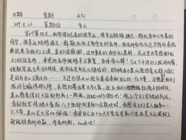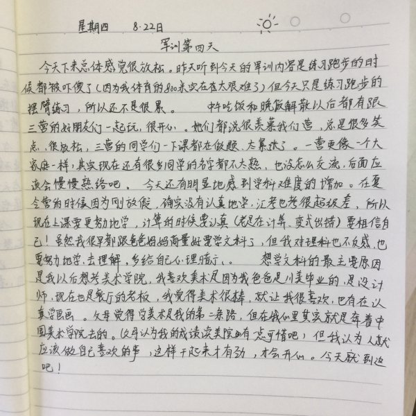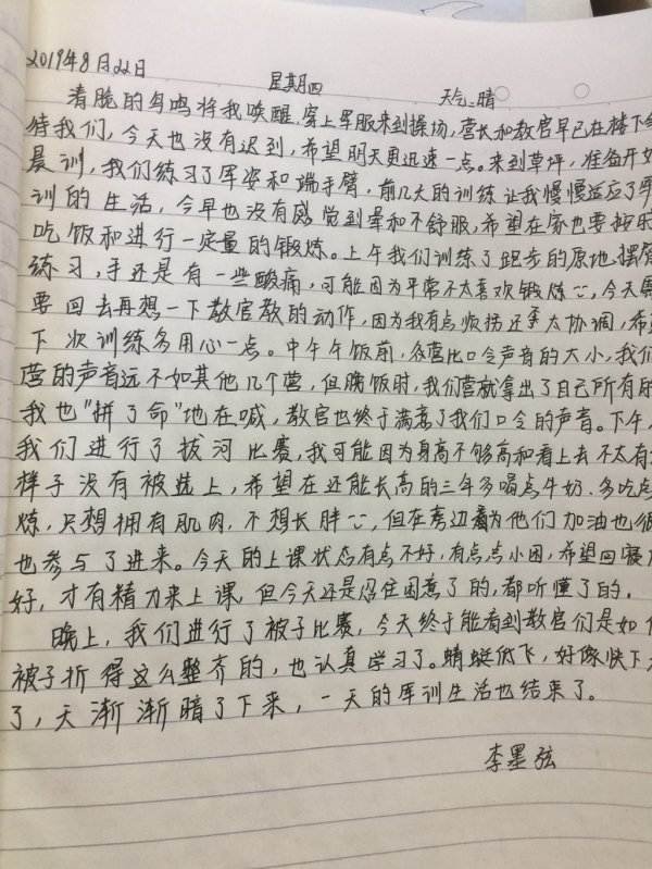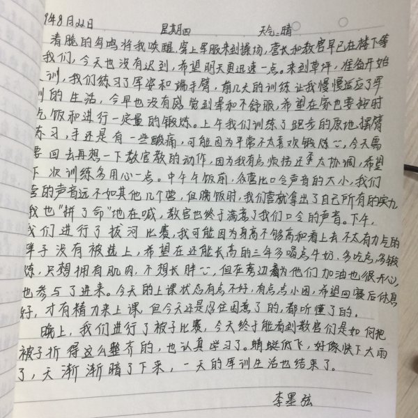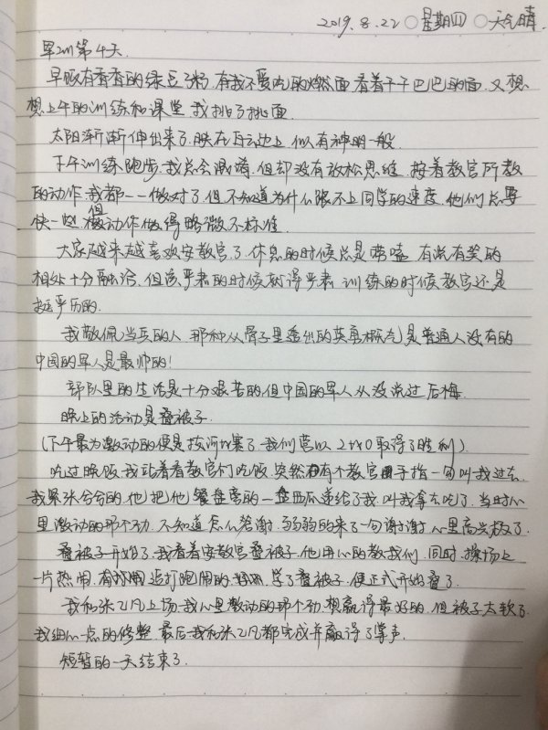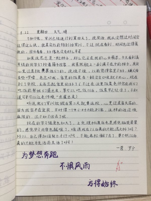 日记是一扇通向难以揣摩的心灵世界的天窗,应该也值得我们每一个人尊重。每天一篇军训日记,流于形式的有,流露心声更多。