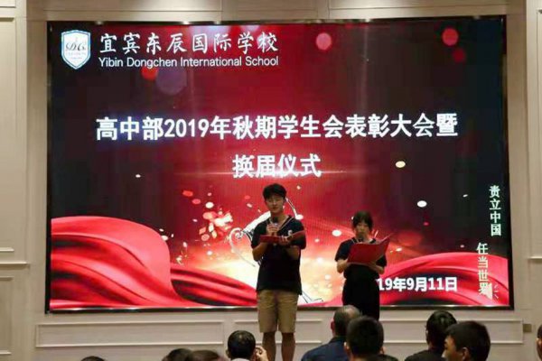 忆往昔春华秋实,展未来风光无限。9月11日下午,宜宾东辰高中部2019届学生会换届暨表彰大会在博雅楼红厅会议室举行。宜宾东辰副校长、高中部校长于驰先生,高中部学生发展中心主任李清明先生、高中部团委书记李娟女士及全体新老学生会干部参加了此次大会。