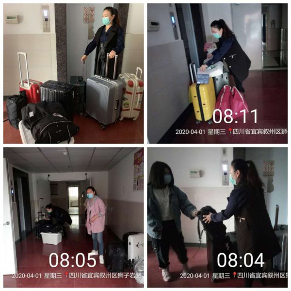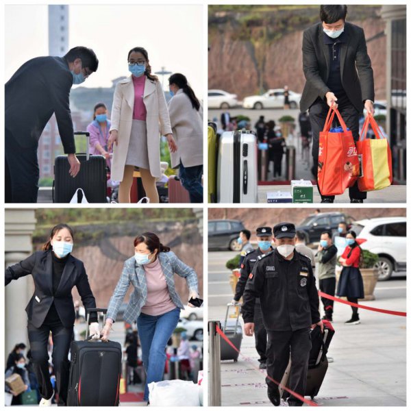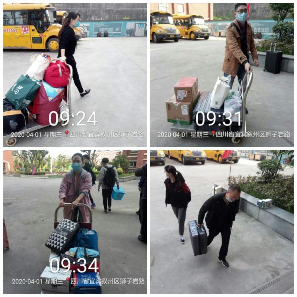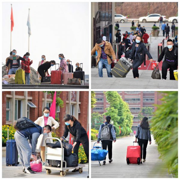 因学生家长禁止进入校园,学校贴心地组织一些老师帮助孩子们搬运行李。