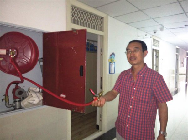 学校每层楼道都安装有消防栓,如突发性火灾发生时,人人都要学会消防栓的使用方法:打开消防栓——取出消防水袋向着火源点延伸展开——接上水枪连接水源——手握水枪头及水管——打开水阀门即可灭火。