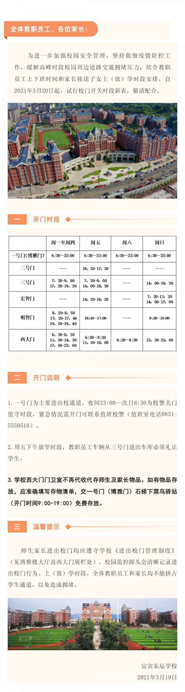 【01号公告】2021年 宜宾东辰学校各校门开关时段表