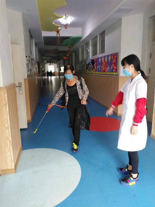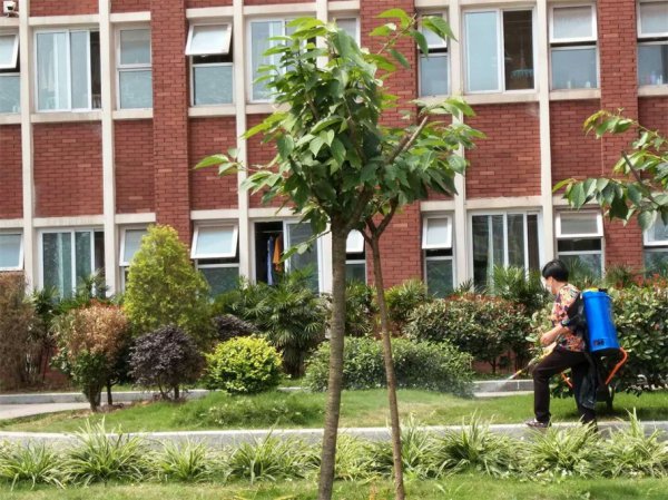 ▲利用学生放假期间对校园进行全面卫生消毒。