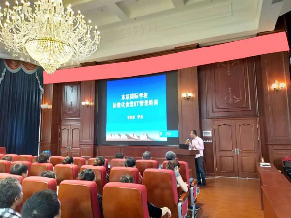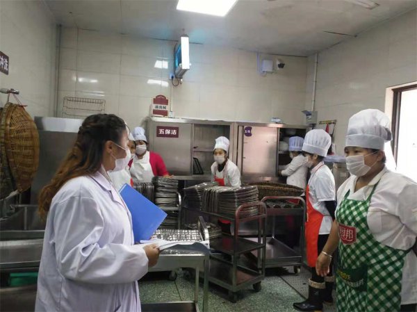▲后勤服务中心主任胡大军、膳食部长罗勇对食堂从业人员仪容仪表、清洁卫生、操作流程、操作规范以及标准化食堂的6T管理培训。